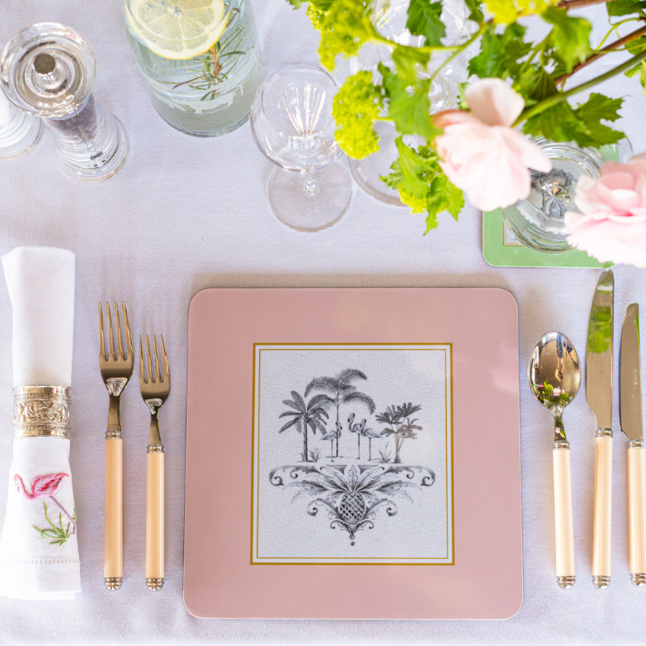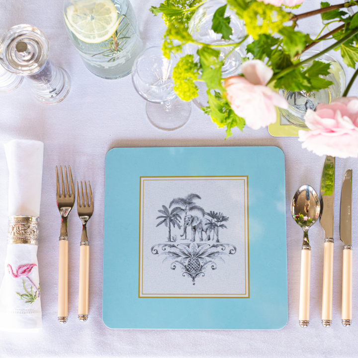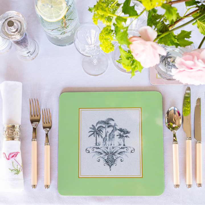 As with all our table mats and coaster sets, the Harlequin set arrives beautifully boxed as a set of 4 featuring a Cheetah with a yellow border, Flamingos with a Pink border, Giraffes with a Green border, and a Elephant with Blue border.
